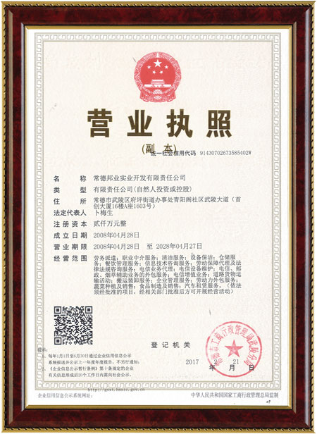 常德邦業實業開發有限責任公司(原名常德市邦業人力資源開發有限責任公司)是經湖南省人力資源和社會保障廳核準備案,常德市人力資源和社會保障局批準,常德市工商行政管理局登記注冊的一家綜合性人力資源服務型企業。公司成立于2008年4月28日,注冊資本2000萬元。